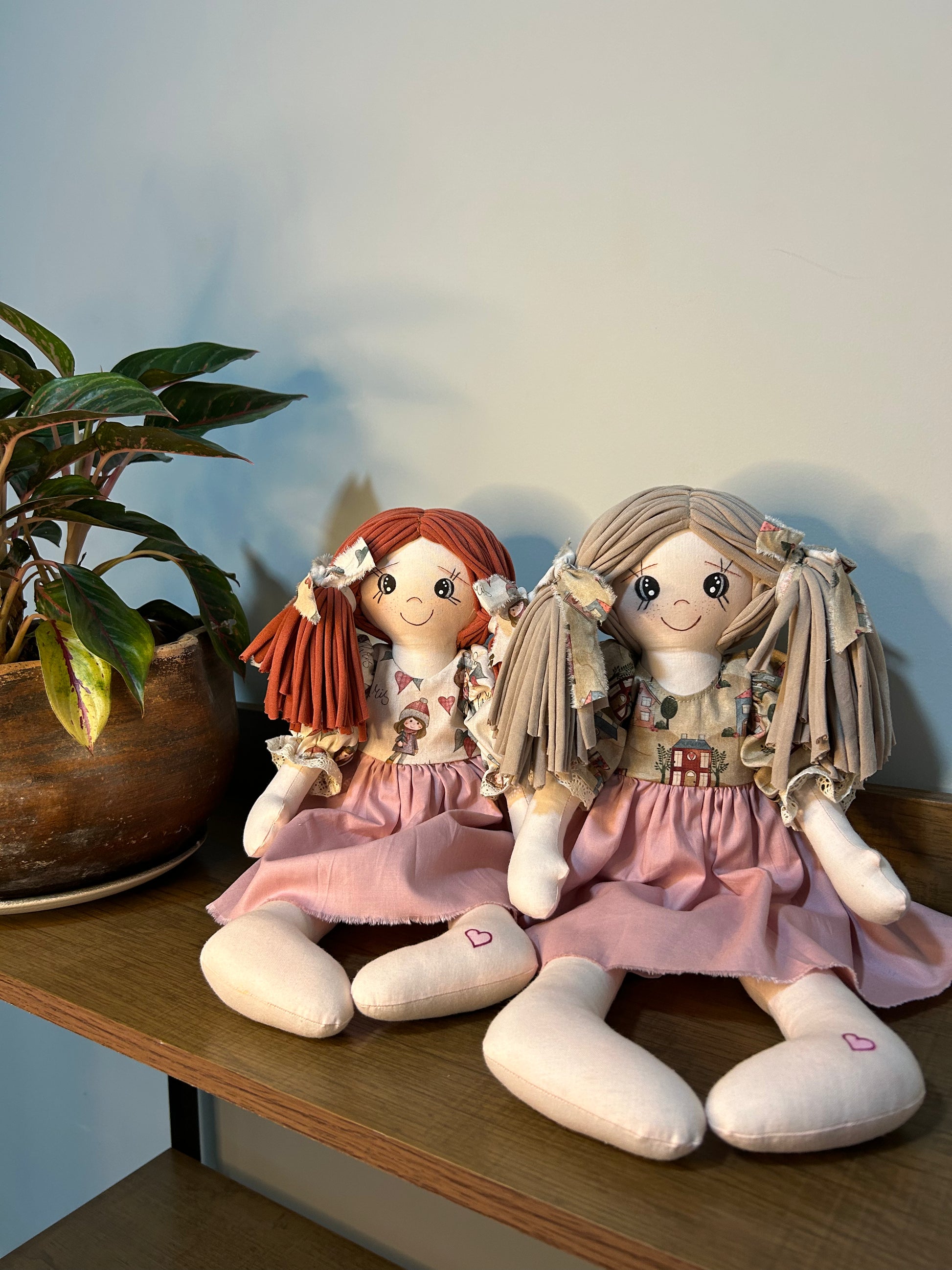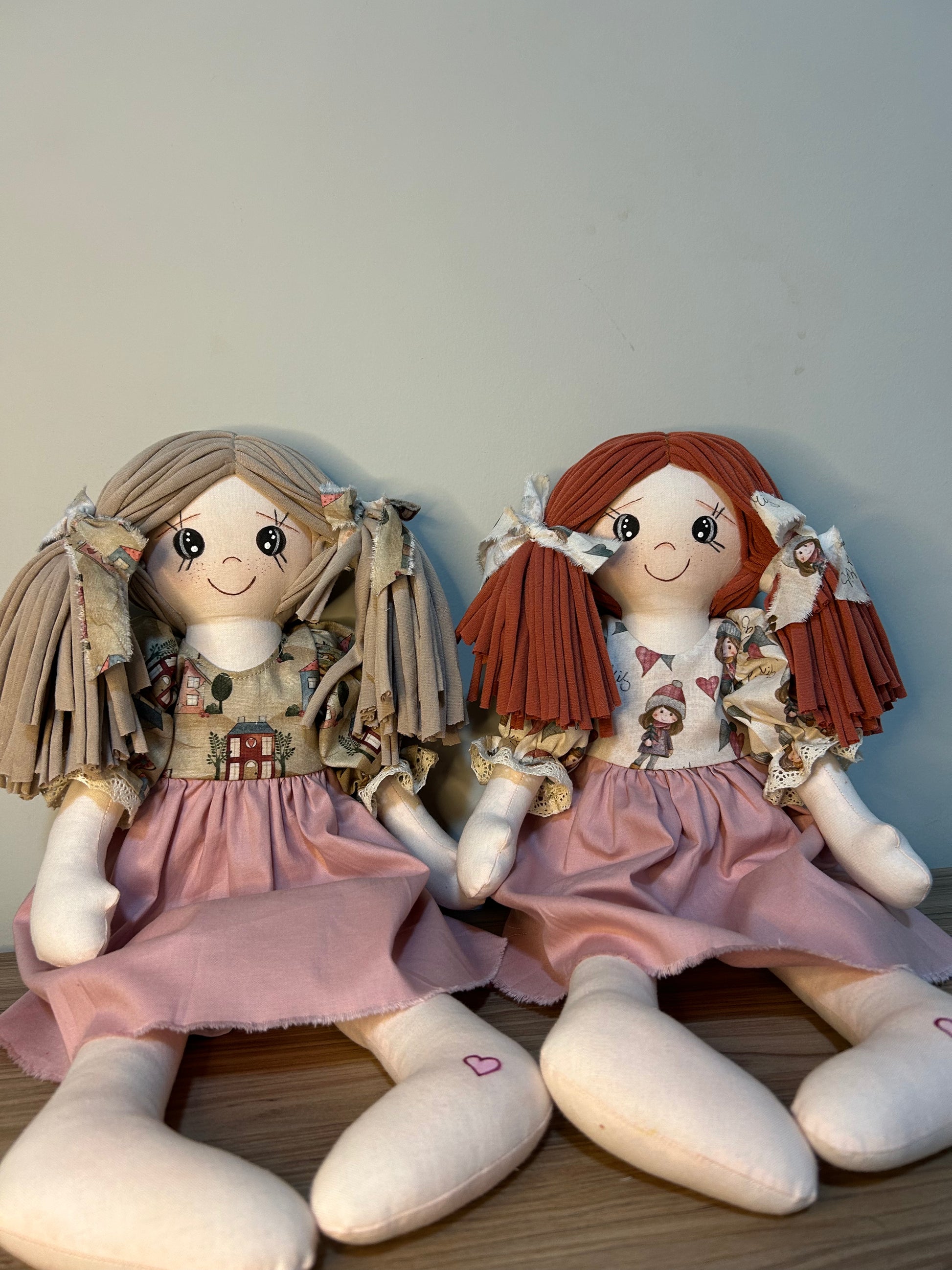 Em um mundo que corre, pare por um instante e sinta a ternura destas companheiras únicas. Apresentamos a dupla perfeita de bonecas de pano, criadas para despertar a magia da infância e eternizar momentos de puro afeto.