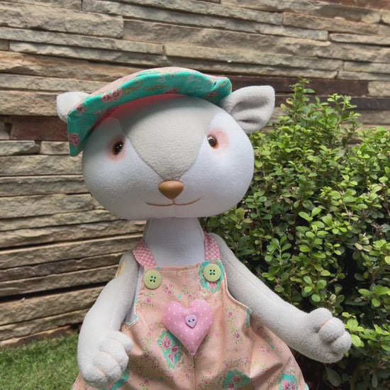 Sua cartola floral e seu macacão delicadamente estampado com um coração bordado são a prova de um trabalho feito à mão com uma atenção impecável aos detalhes . Cada costura, cada botão e a escolha cuidadosa dos tecidos revelam a paixão artesanal que se torna única no mundo e pronta para ser a nova protagonista das mais lindas histórias e travessuras.